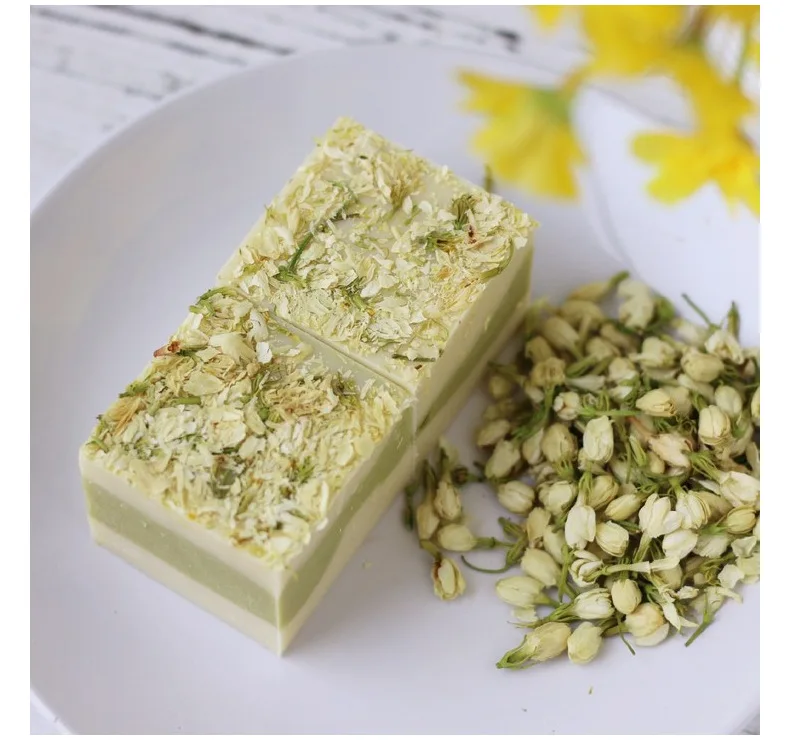 Jasmine soap ingredient: Calendula pedicel soaked in EV olive oil, coconut oil, mustard oil, cocoa butter butter, rose hip oil, almond nut oil, angelica dahurica, bletilla striata, atractylodes macrocephala, white poria cocos, paeonia lactiflora, milk, purified water, sea water alkali